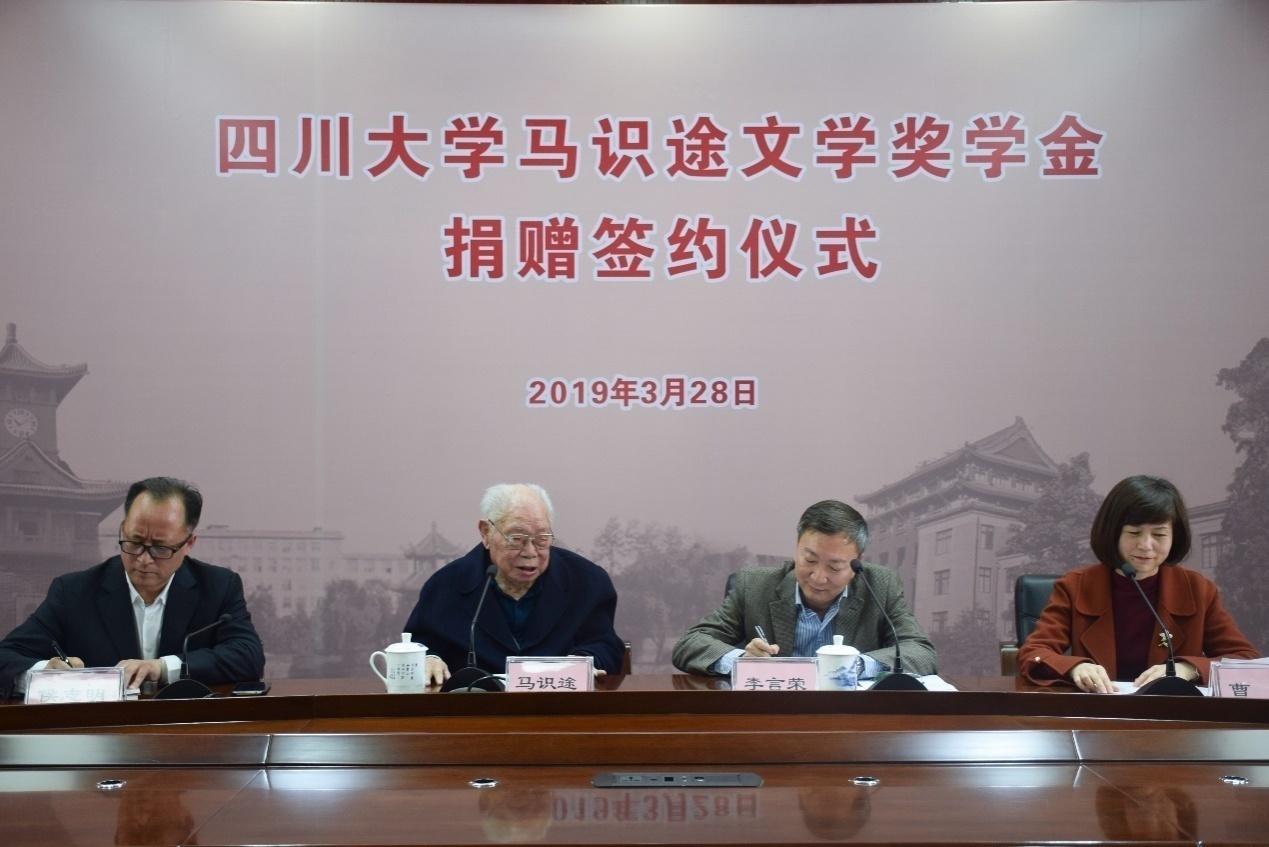 举行的“马识途文学奖学金”捐赠签约仪式现场暖意流动。我国著名革命家、文学家、书法家,我校杰出校友、特聘教授马识途先生出席仪式并向a漫