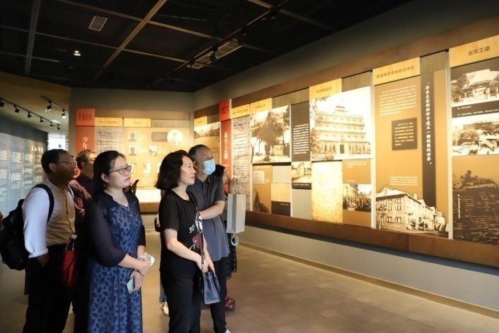 师生不时驻足,一字一句地品读着每一张老照片背后的故事,透过布满斑驳印记和沧桑的文物,追忆前贤的足迹,回溯长江不畏艰难险阻远行千里,鞠躬尽瘁只求真理真相的革命风骨和崇高精神。