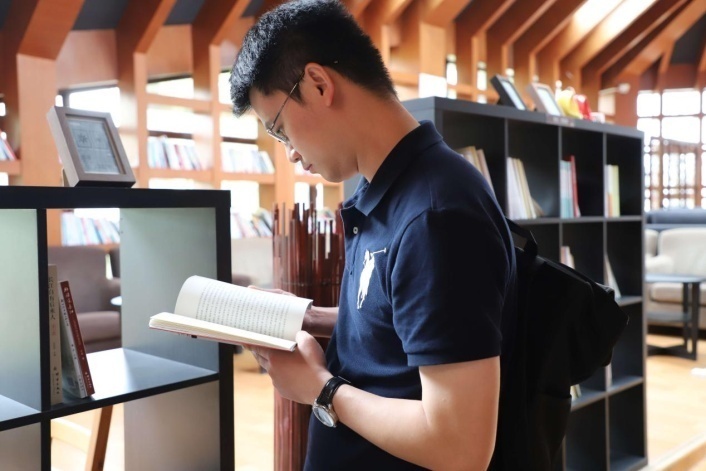 党政办主任银浩老师阅看党员书吧里的范长江著作