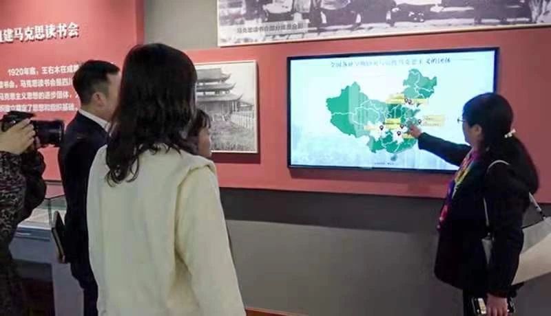 师生不时驻足,俯身靠近展柜内的文物仔细阅看,一字一句地品读着每一张老照片背后的故事。其中一块电子展板尤其惹人注目,上面勾勒着马克思读书会的创办始末,并以地图呈现出全国早期马克思主义的研究与传播情况,这引发了参访师生的关注与思索。a漫