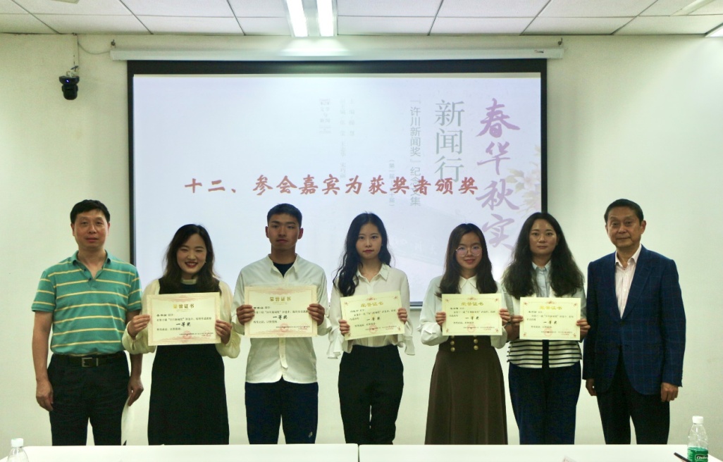 许晓舟理事长(右1)、古立峰书记(左1)为“许川新闻奖”一等奖获奖者颁奖