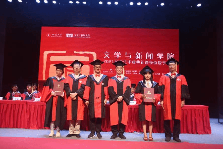 曹顺庆教授、古立峰书记、李怡院长在主会场为2018级中国现当代文学硕士生张益智、2018级新闻与传播学硕士生宋信祺、2018级艺术学理论硕士生漆依依、2017级汉语言文学本科生刘玏、2017级汉语言文学本科生刘霁月、2017级网络与新媒体本科生刘雨凡、2017级广告学本科生钱青云共七名2021届校友联络人颁发聘书后,学位授予仪式正式开始。伴随着乐声,主会场a漫