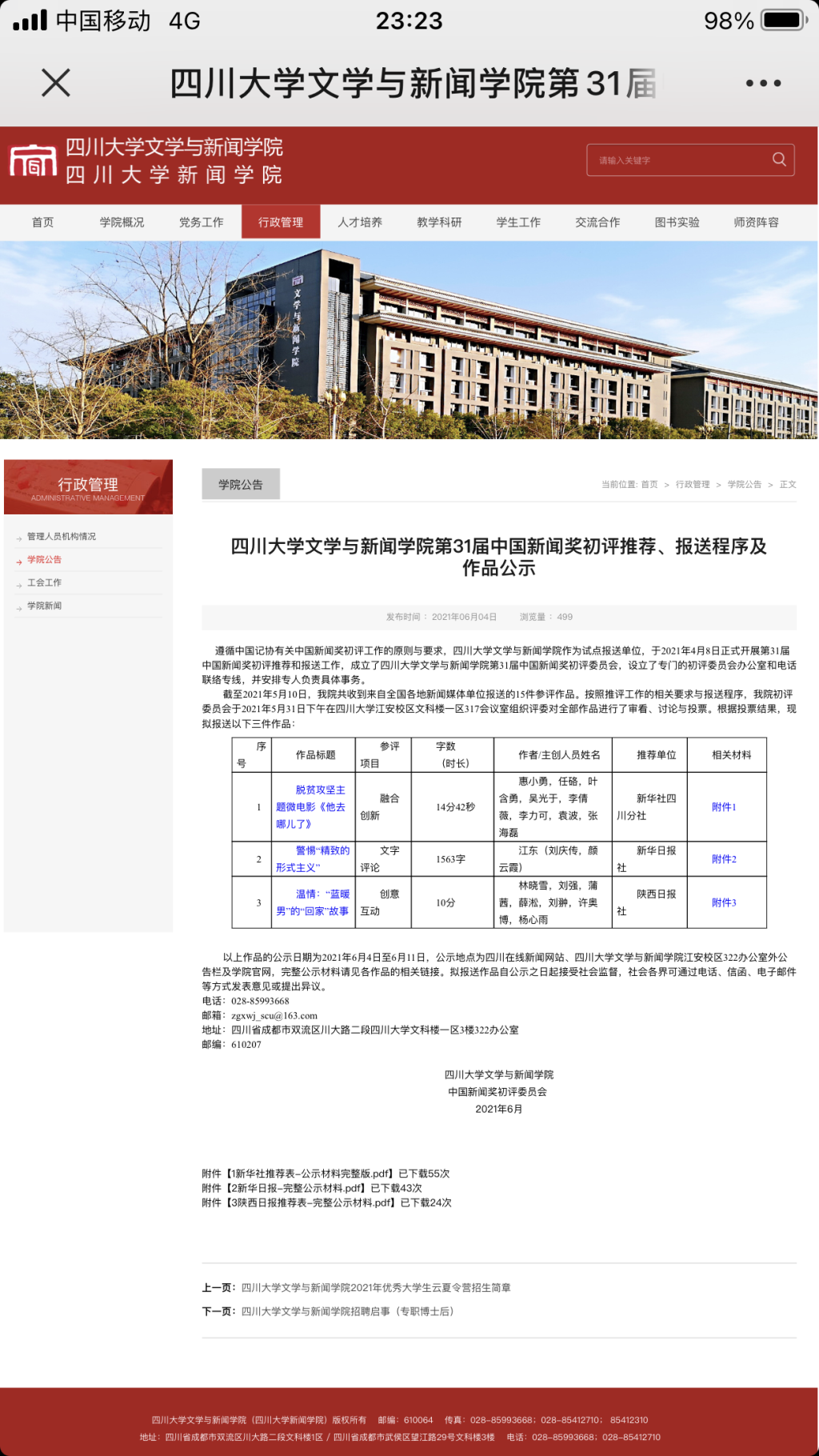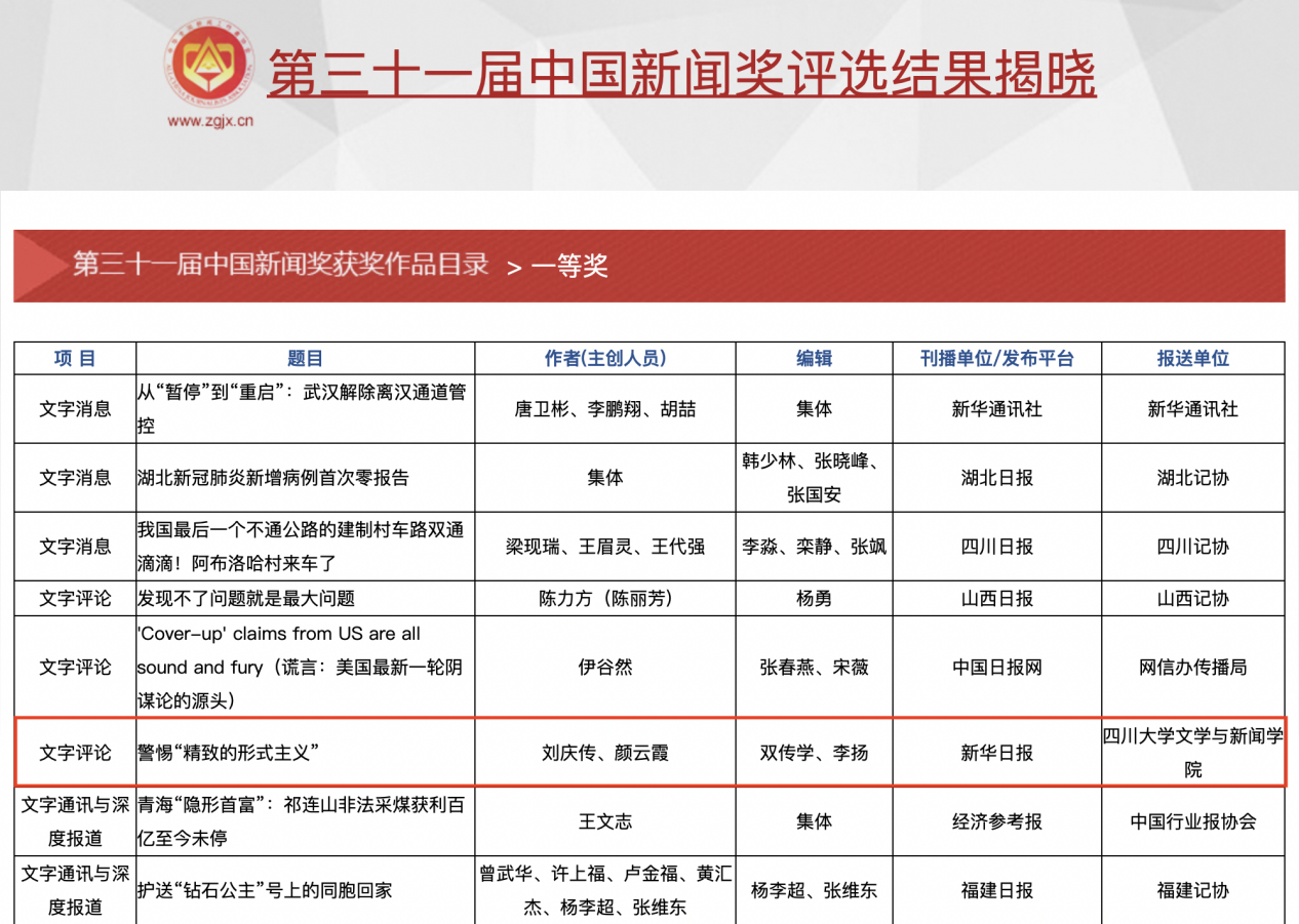 2021年11月7日,中华全国新闻工作者协会主办的第三十一届中国新闻奖评选结果揭晓,四川大学文学与新闻学院报送的新华日报作品《警惕“精致的形式主义”》喜获第三十一届中国新闻奖一等奖,是此届中国新闻奖一等奖中仅有的三篇文字评论之一。这是自2016年起担任试点报送单位以来,a漫