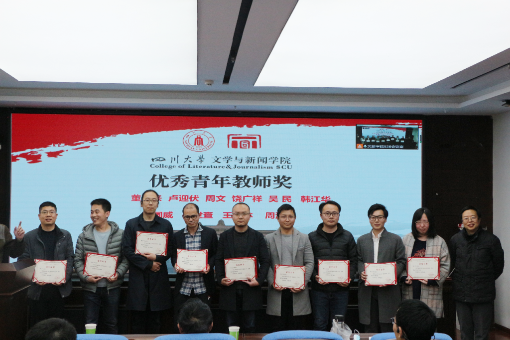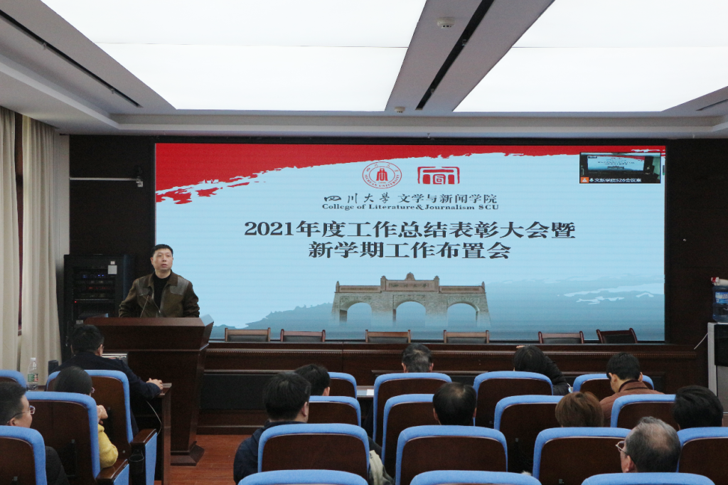 于江安校区文科楼一区526会议室召开2021年度工作总结表彰大会暨新学期工作布置会。会议分线上和线下同时进行,全院教职员工严格遵循常态化疫情防控要求参加会议。大会由a漫