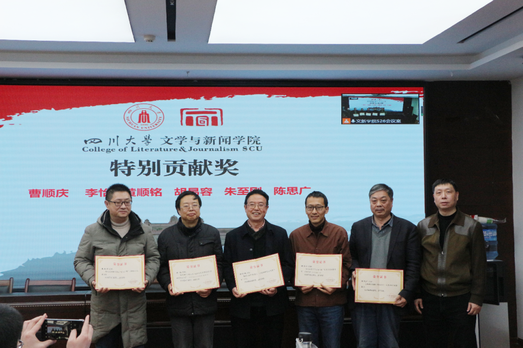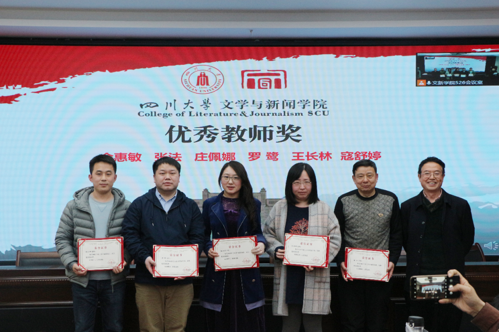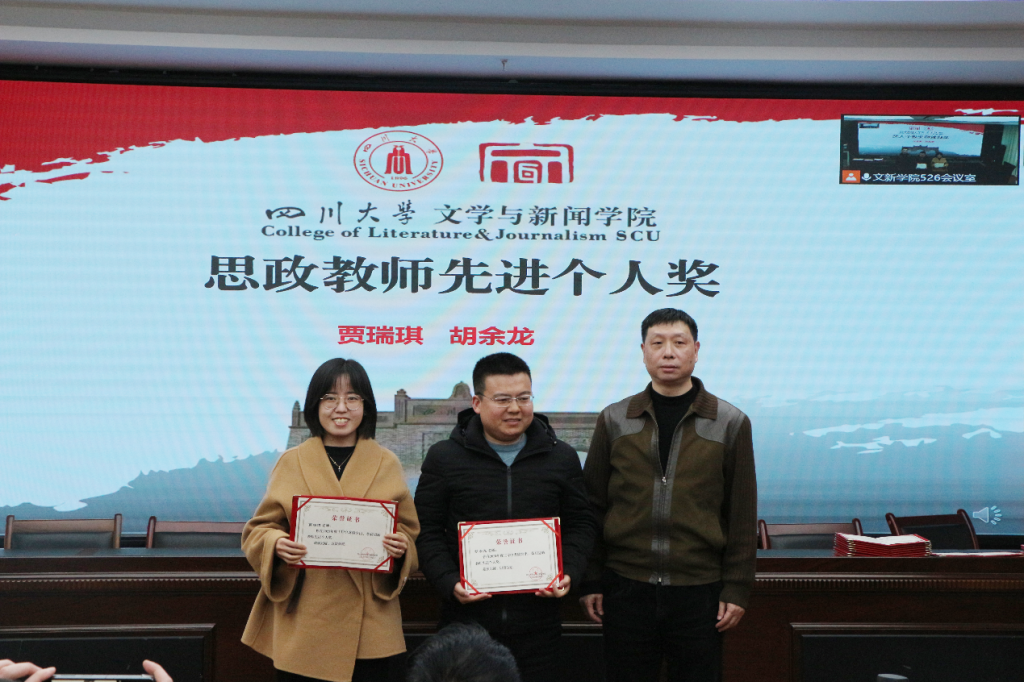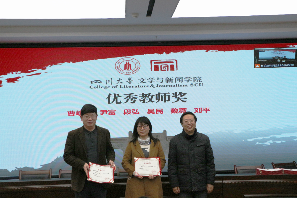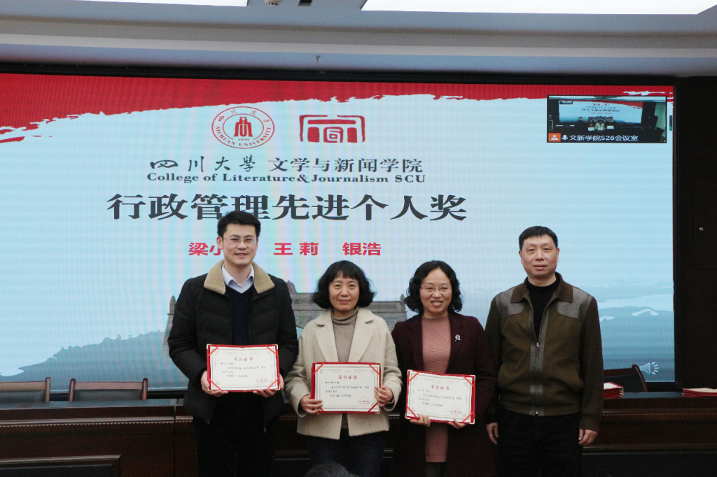 对各项工作表彰的获奖名单并说明了评奖原则。在欢快热烈的音乐中,古立峰书记、李怡院长与学术院长曹顺庆教授共同为a漫