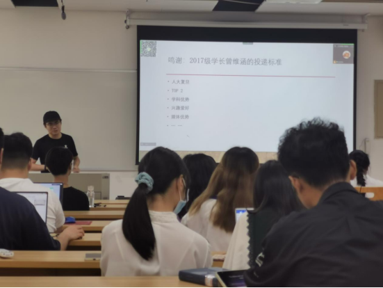 随后,经验分享环节正式开始。首先是中文专场,莫凯洁同学作为第一位分享同学从“知道保研是什么”“在保研中做了什么”两个问题开启了本次分享会之旅,她按照“三步走”的策略阐述了“目标确定”“步骤分明”和“行动办法”。牛童同学讲述了自己从国际知名暑校到成功保研的多彩经历,尤其是将出国留学准备工作和国内保研准备工作融合在一起,为同学们提供了针对性的借鉴经验。崔逸灵同学以“普通人保研指南”为题,生动形象地为面临保研焦虑的同学“开处方”“避禁忌”。向宇歌同学和王一丹同学分别用时间轴的方式展示了自己保研过程中的具体安排,为大家梳理了更加清晰的时间管理步骤,并介绍了部分学校的夏令营时间安排和部分公开的面试流程。赵嘉宁同学则先是讲述了自己在保研路上曲折但激励人心的故事,后又无私分享给大家详细的资源清单。彭笑秋同学以录制视频的方式为大家分享保研路上的几个关键步骤“发现兴趣-收集信息-明确定位-供需对接”的心得,十七分钟的视频充满干货。