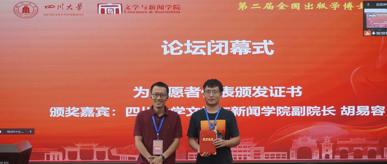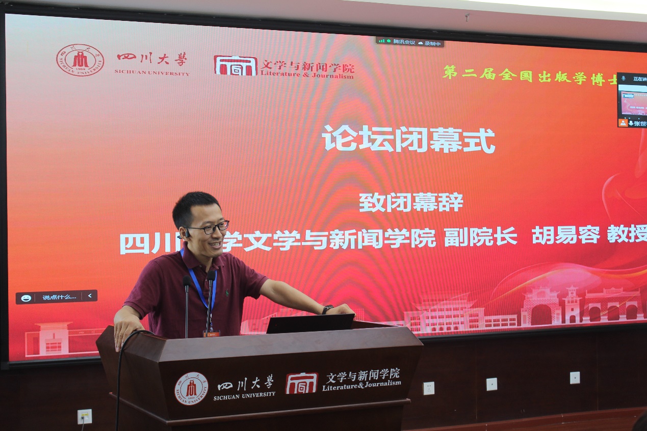 副院长胡易容教授致闭幕词,他简要介绍了学院学科建设及科研育人的特色举措,以及学院出版学科的发展简况。他表示,博士生论坛这个学术交流平台对人才培养有着十分重要的促进作用,本届论坛的举办是川大出版学院落实打造人才培养新标杆的系列举措之一,并对出版学青年博士发出了邀请。