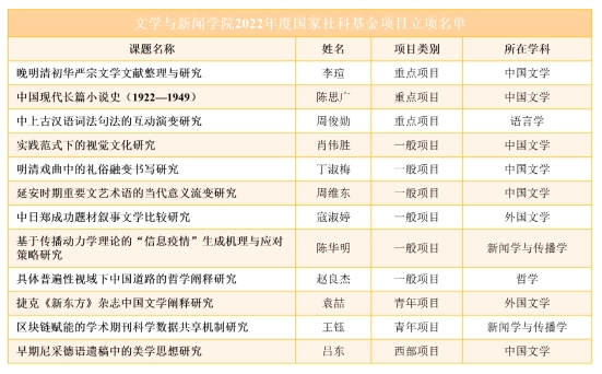 12项立项数的分布为:国家社科基金重点项目3项,一般项目6项,青年项目2项,西部项目1项。从国家社科基金学科分类来看,涉及中国文学、语言学、外国文学、新闻学与传播学、哲学5个学科。其中,中国文学共获6项立项,在全国设有中文系的学院中位居第一。