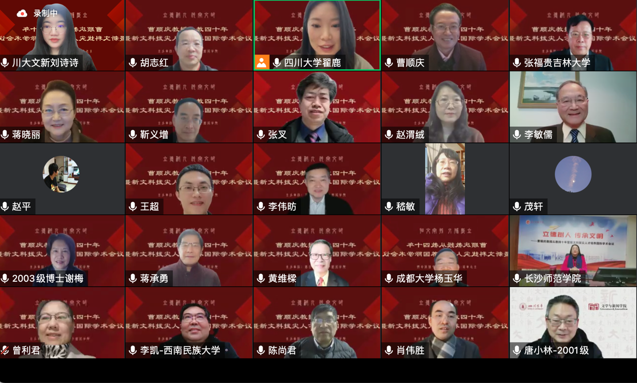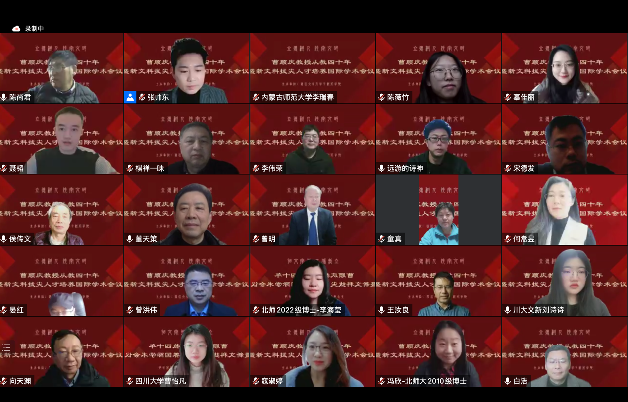 主办的“立德树人 传承文明——曹顺庆教授从教四十年暨新文科拔尖人才培养”国际学术会议在云端顺利举行,来自法国索邦大学、美国俄亥俄州立大学、越南胡志明市国家大学、香港中文大学、中国社会科学院、北京师范大学、北京外国语大学、中央民族大学、首都师范大学、吉林大学、复旦大学、上海交通大学、浙江大学、浙江师范大学、浙江工商大学、河南大学、湖南大学、湘潭大学、长沙师范学院、华中科技大学、广西大学、暨南大学、电子科技大学、成都大学、四川外国语大学、四川师范大学、西南大学、西南交通大学、西南民族大学、重庆师范大学、重庆大学、贵州师范大学、西北民族大学、a漫