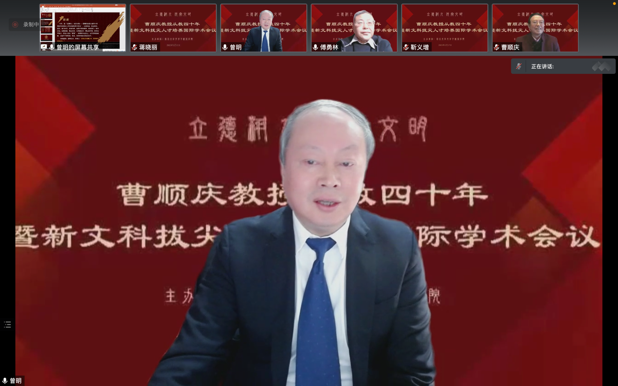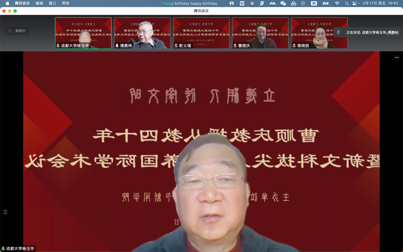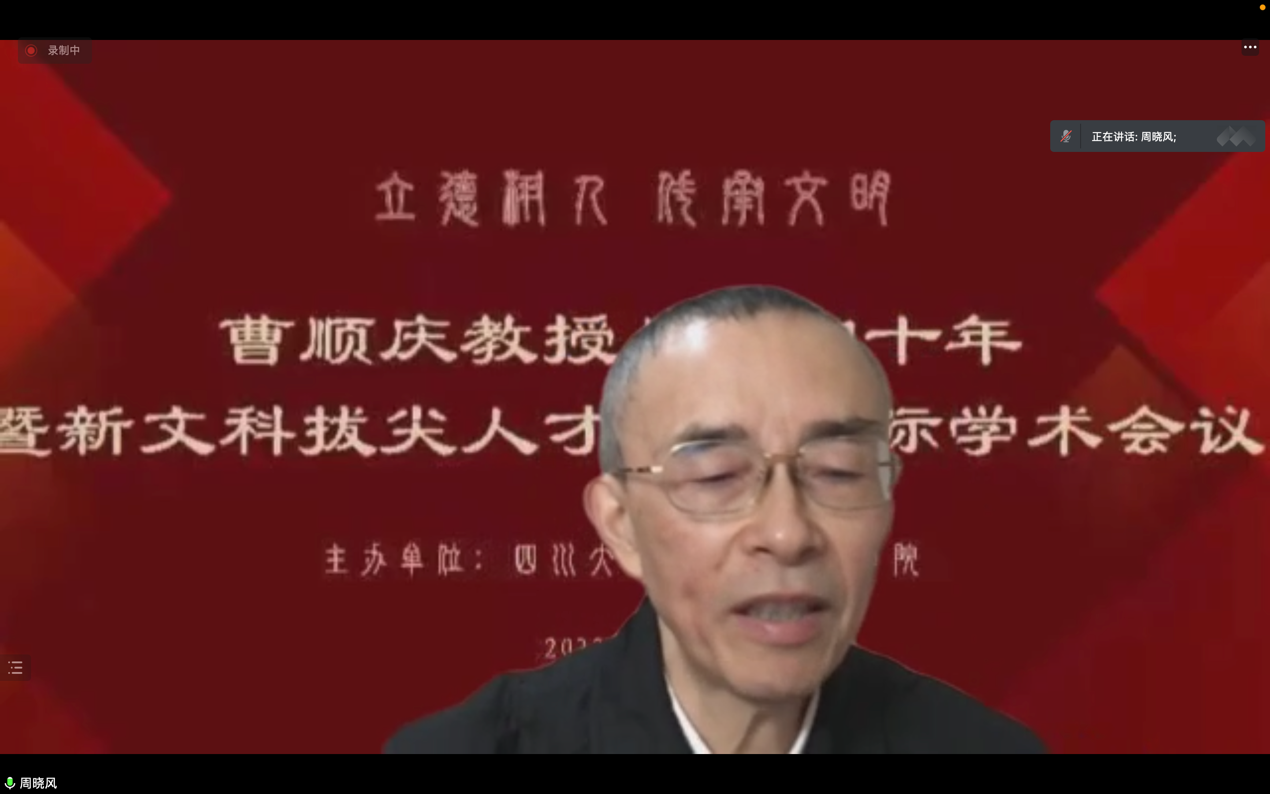 校长李言荣院士在视频致辞中表示,培养人才和创造知识是一所大学的根和本,这两大责任和使命都离不开一流的师资队伍来支撑。曹顺庆教授不仅教书育人,也言传身教,视学术为生命、以育人为己任,耕耘不辍、孜孜不倦,在学术领域成就卓著、享誉国际,在拔尖人才培养方面更是桃李芬芳,他的品格与情怀足以成为川大后学的精神财富和激励大家“立德树人 传承文明”的宝贵经验。