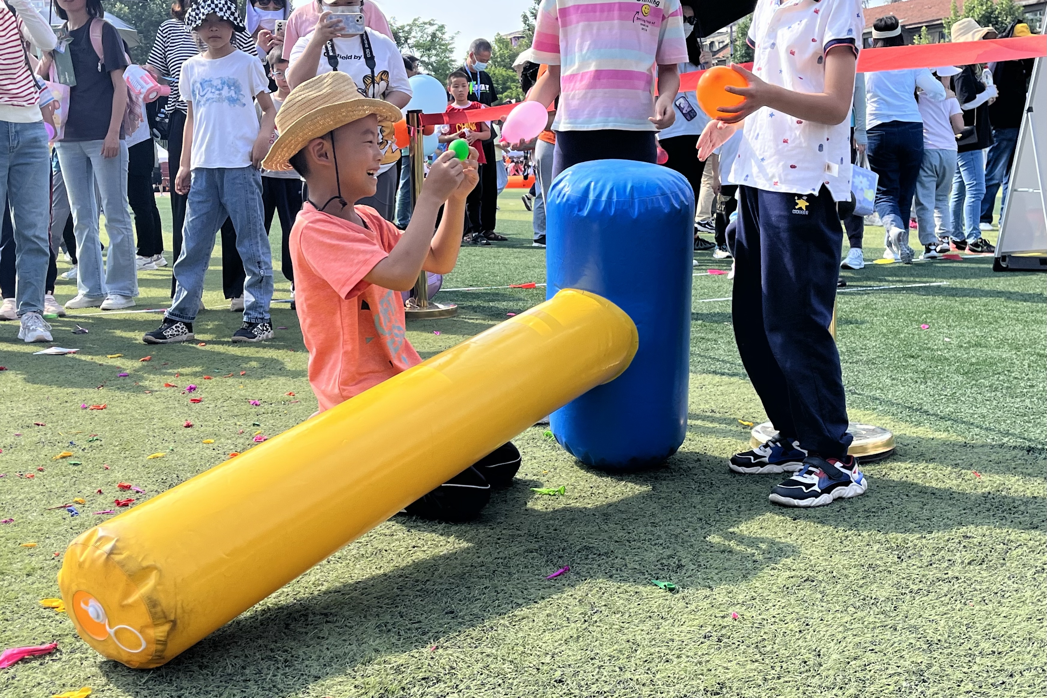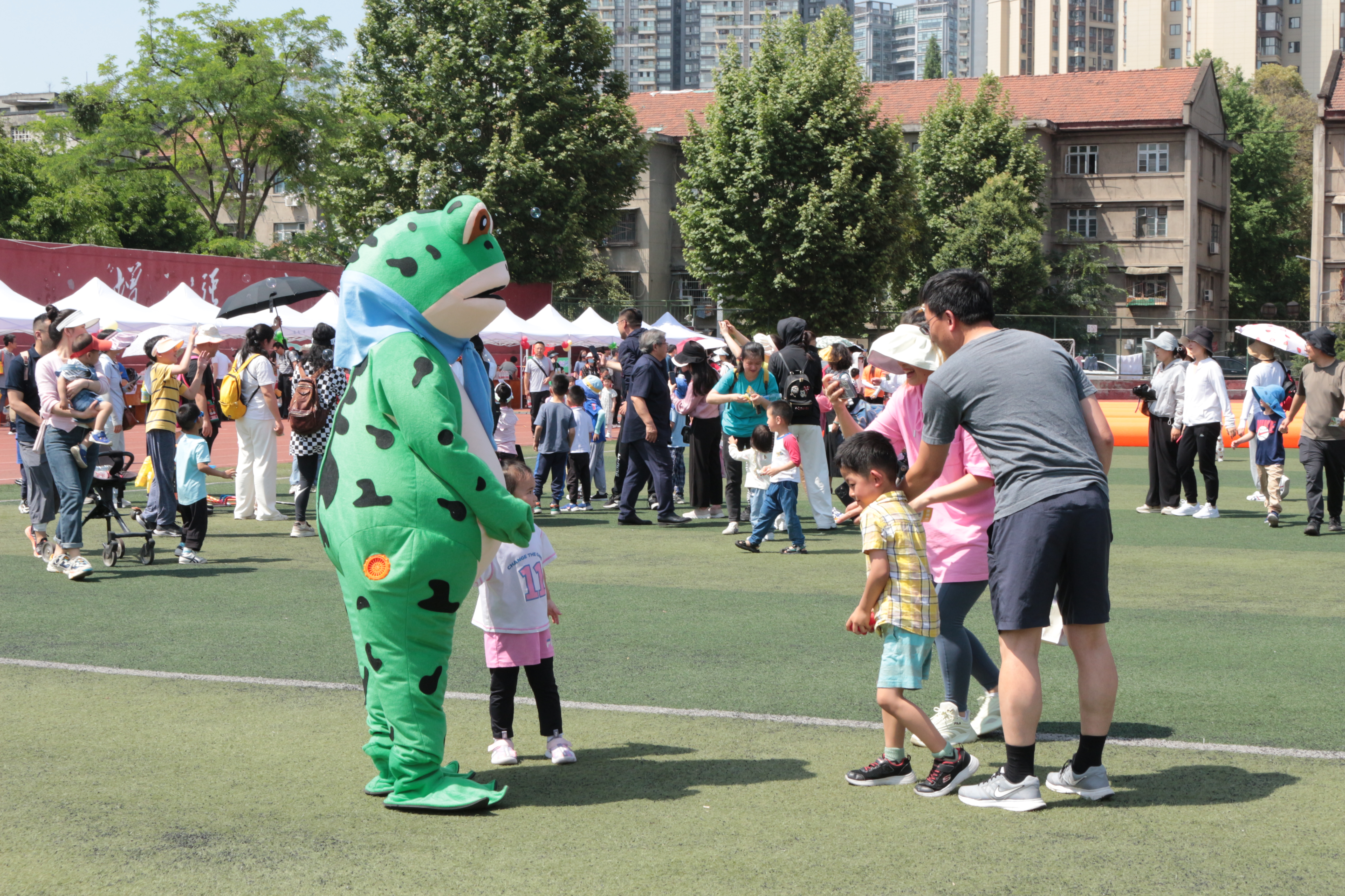 积极组织教职工及其子女参与本次亲子趣味运动会。活动现场设有“雷神之锤”“丢沙包”“射箭达人”“飞行棋”“枕头大战”等多个趣味运动项目。此外,现场还为大家准备了小丑表演、泡泡秀,与蓉宝、网红青蛙、创意相框等童趣元素合影打卡的游园体验环节。教职工亲子组队参加活动获得印章还可在兑奖区域兑换精美礼品。精心设计的比赛项目激发了大家的运动热情,小朋友们和家长默契配合,努力完成各个运动项目。运动场上加油声此起彼伏,整个场地变成了欢乐的海洋、亲子的乐园,大家的脸上都洋溢着幸福欢乐的笑容。