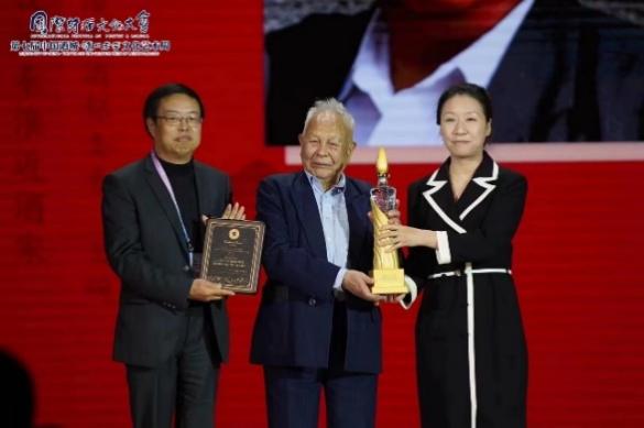 院长李怡,泸州老窖集团党委委员、元景达食品有限公司董事长兼总经理潘丽娜共同为谢冕先生颁发2023年度“1573金沙诗歌奖·诗歌评论特别贡献奖。