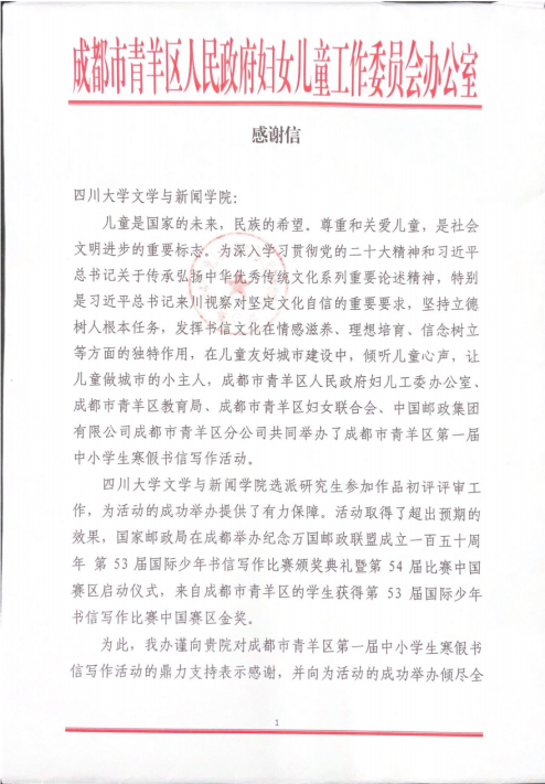 应青羊区政府妇儿工委办公室邀请,选派研究生参加青羊区第一届中小学生寒假书信写作活动作品初评评审工作,来自成都市青羊区的学生在第53届中国国际少年书信比赛中国赛区获金奖,并获得第53届国际少年书信比赛银奖,相关内容获中国少年报头版报道。