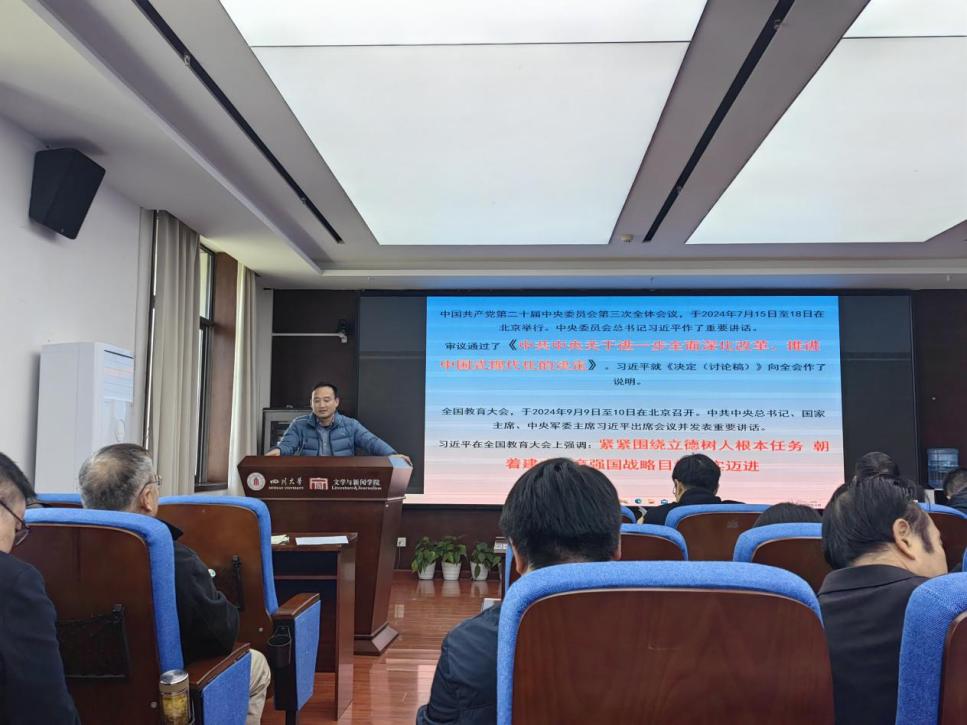 11月29日,学院在江安校区文科楼一区526会议室召开学习贯彻党的二十届三中全会精神宣讲会暨全院教职工大会。a漫