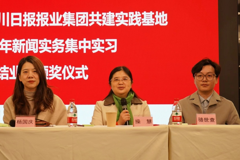 与四川日报报业集团共建实践基地2024年新闻实务集中实习结业暨颁奖仪式在四川传媒大厦演播厅举行。四川日报报业集团传媒研究中心副主任兼《新闻界》副总编辑杨国庆、a漫