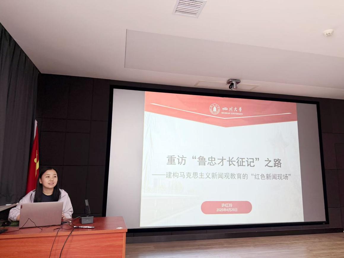 博士生许红玲以“重访‘鲁忠才长征记’之路——建构马克思主义新闻观教育的‘红色新闻现场’”为主题作了汇报交流。她以1941年《解放日报》刊载的经典调查报告为切入点,通过实地重走陕甘宁边区运盐调研路线的田野实践,还原了《鲁忠才长征记》的创作背景。她在报告时指出,毛泽东同志推崇的“简洁文风”与“扎实调研”作风,正是当代新闻工作者践行马克思主义新闻观的历史镜鉴。她提出,将红色新闻遗址转化为教育现场,以“行走的课堂”推动马克思主义新闻观教育与党史、地方实践相结合,是创新人才培养的重要载体。