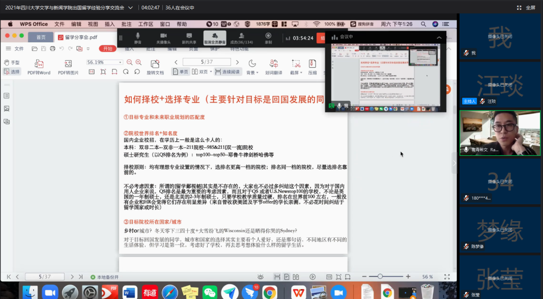 最后一位分享嘉宾是研究生就读于悉尼大学Master of Media Practice专业的蒋青希文同学。他重点介绍了如何安排大学四年的时间点和规划,从而为出国留学做准备为为同学们提供了案例借鉴。同时对出国留学后想要回国发展的同学提供了选择学校和专业的针对性建议。