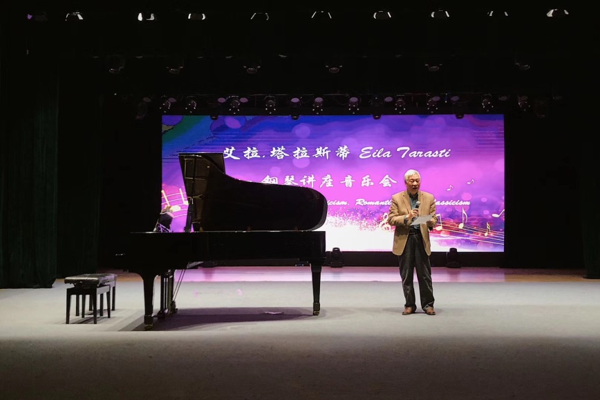 教授、符号学-传媒学研究所所长赵毅衡教授主持开场。作为学术主持人,赵毅衡教授向大家介绍了塔拉斯蒂教授夫妇,并介绍了音乐会的背景。他说:本次音乐会形式独特,现场由艾拉·塔拉斯蒂教授演奏,埃罗·塔拉斯蒂教授讲解每段乐章展现的风格与历史渊源。将音乐与学术相融合,埃罗·塔拉斯蒂教授夫妇为大家带来了一次难得的听觉与思想盛宴。