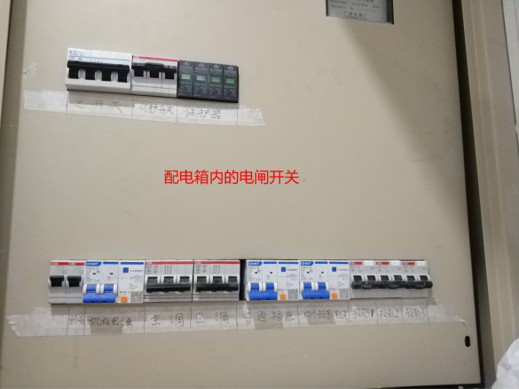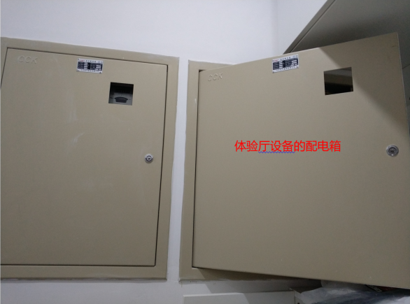 1. 打开配电箱内的全部电闸开关;配电箱位于体验厅右侧的机房内,墙面上右侧的配电箱为体验厅内设备的配电箱。