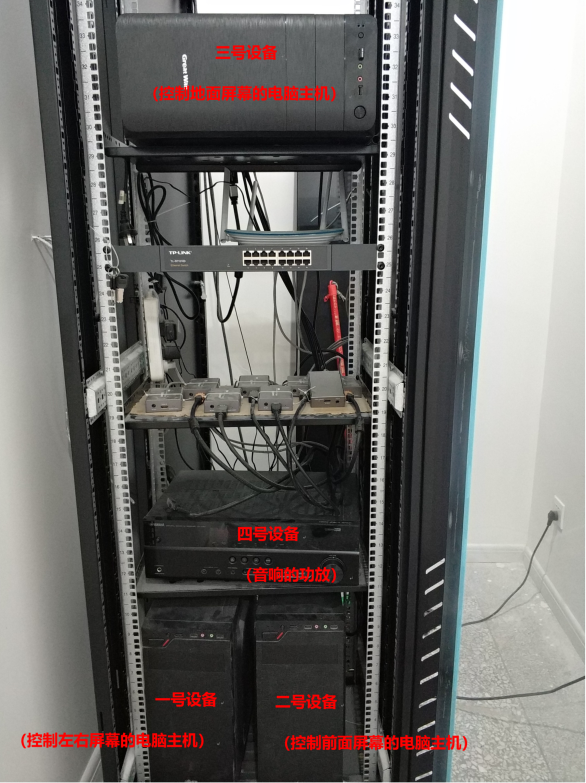 2. 打开机柜内的设备电源开关;按照顺序打开一号设备(控制左右屏幕的电脑主机)、二号设备(控制前面屏幕的电脑主机)、三号设备(控制地面屏幕的电脑主机)、四号设备(音响的功放),其中一号二号设备打开后等待30秒再打开三号四号设备;机柜位于体验厅右侧的机房内。