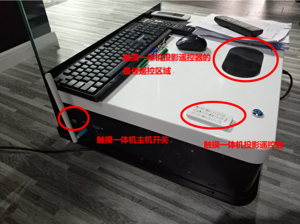 3. 打开播放视频的触摸一体机开关;先打开底部操作台左侧的主机开关,再用遥控器打开底部的投影开关。