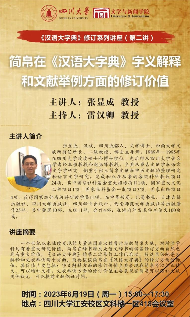 江安校区文科楼一区526会议室开展。西南大学博士生导师张显成教授作了题为“简帛在《汉语大字典》字义解释和文献举例方面的修订价值”的讲座。a漫