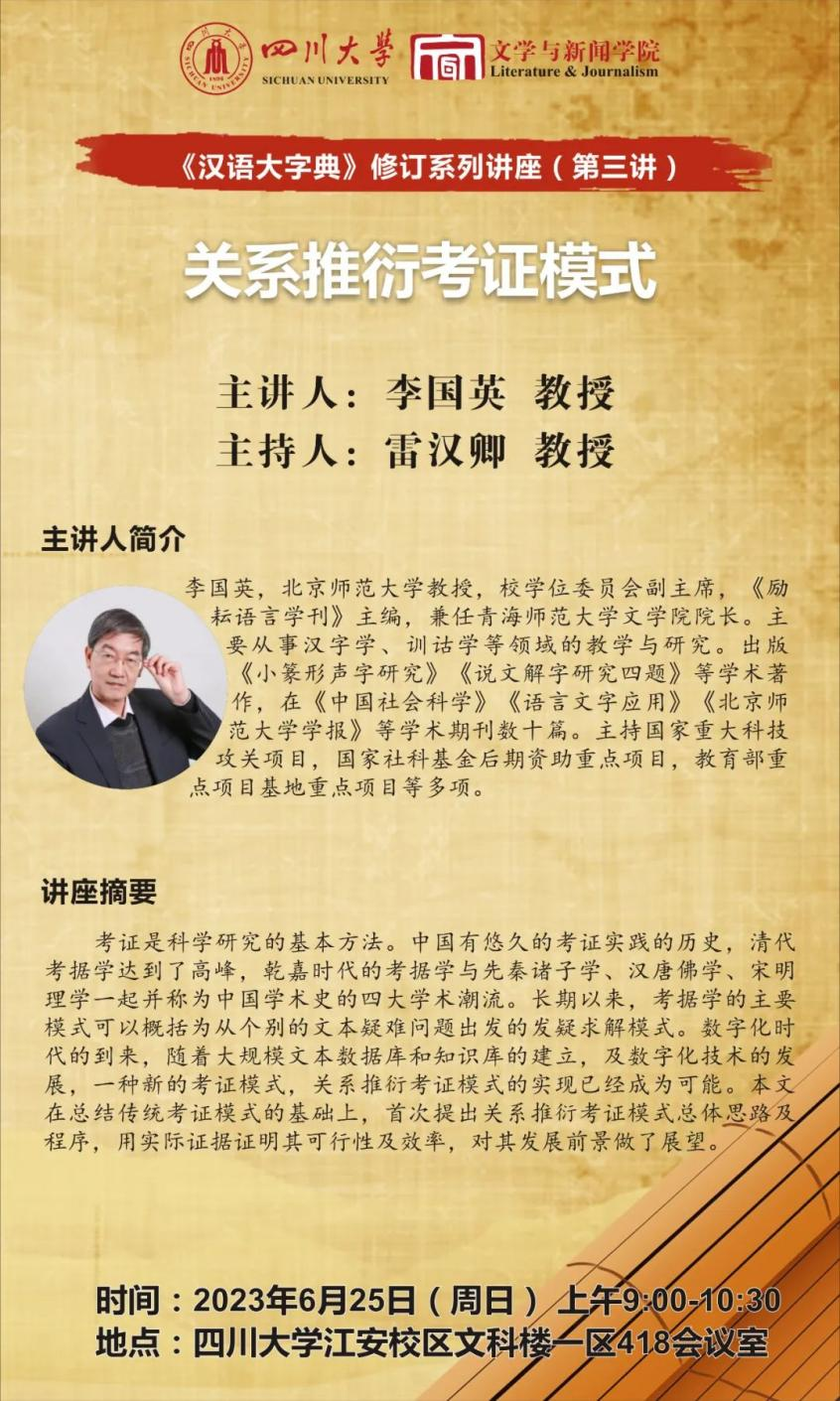 江安校区文科楼一区418会议室开展。北京师范大学教授、校学位委员会副主席李国英教授作为主讲人将作题为“关系推演考证模式”的讲座。a漫