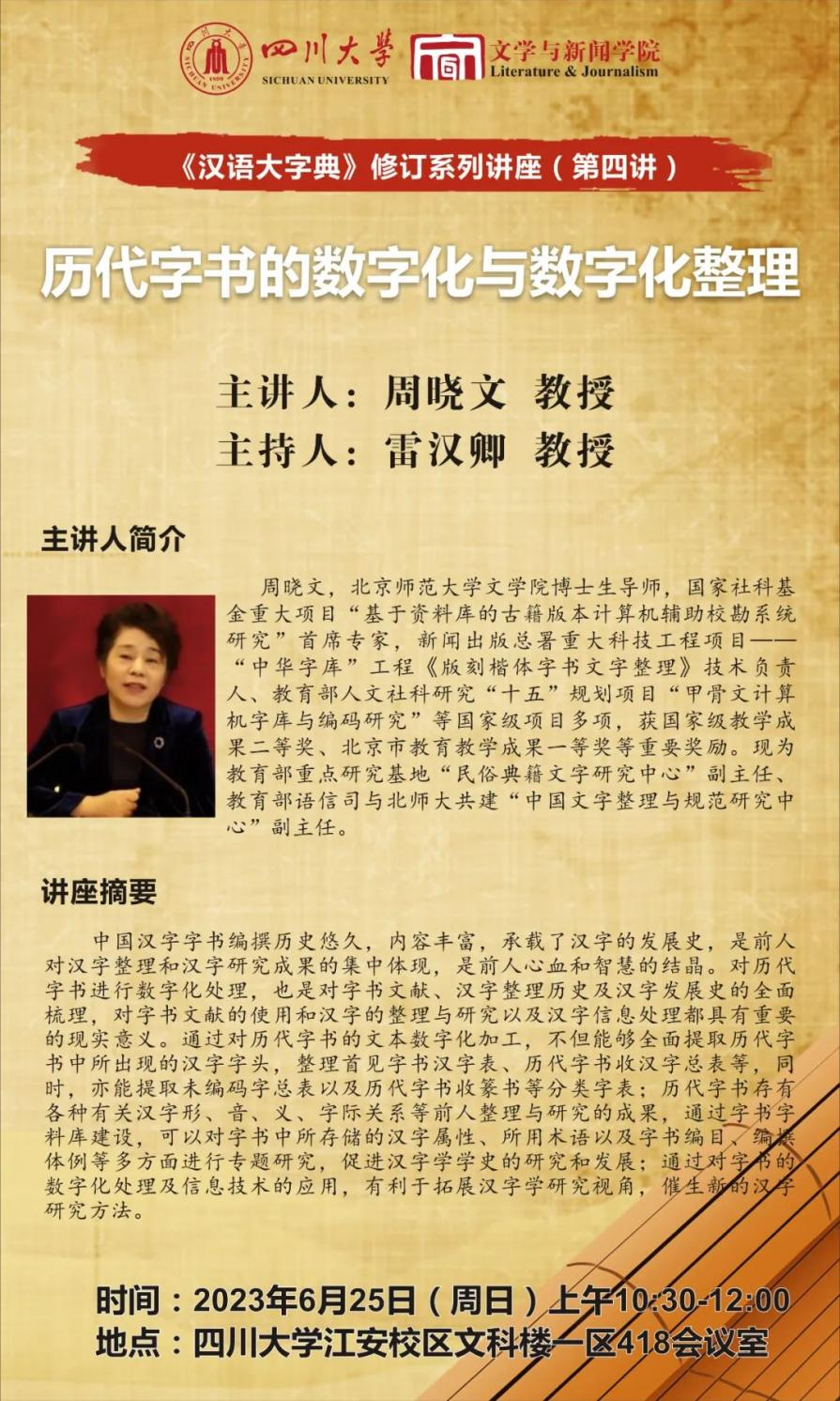 《汉语大字典》修订系列讲座(第四讲)将于2023年6月25日上午10:30至12:00在a漫